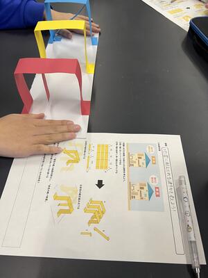 理科の授業では地震に耐えられる建物について学習しました。色画用紙を使って建物を作り、どのような構造がゆれが少ないか考えました。