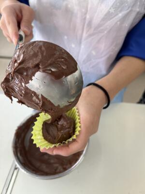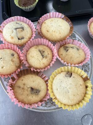家庭科の授業では調理実習でチョコマフィンを作りました。チョコチップとココアの2種類作りました。