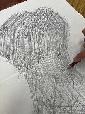 美術の授業では自画像を描きはじめました。鉛筆がきから、絵の具で色をつけていきます。
