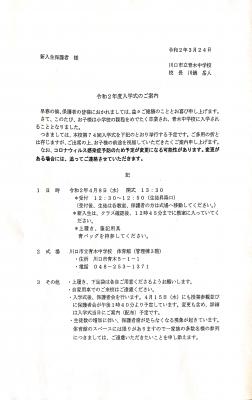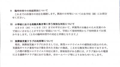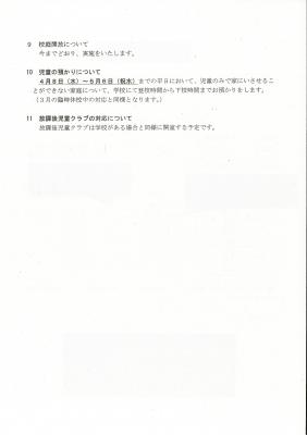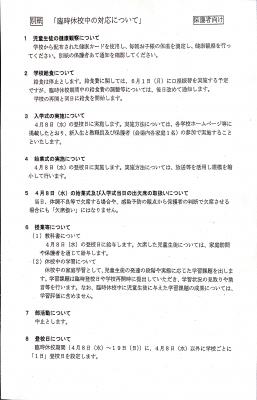 また、新1年生は4月15日、2年生は14日、3年生は13日に8時20分から1時間程度の登校日を予定しております。持ち物等、詳細については4月8日に生徒を通じてお知らせいたします。