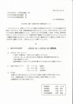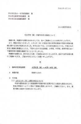 川口市においては、4月に入っても新型コロナウィルス感染の収束傾向はみられず、感染拡大への懸念が強まっております。国の緊急事態宣言が今後発令されることから、市立の小・中・高等学校及び幼稚園の臨時休校期間を5月6日まで延長することとなりました。